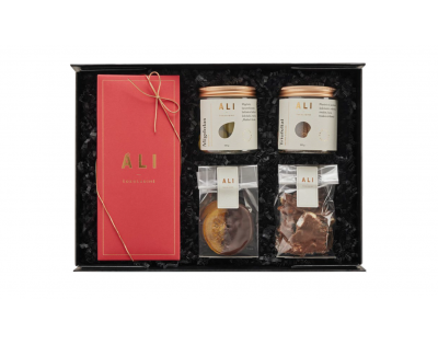 Rinkinyje: Saldainių DIP PRALINE rinkinys (12 vnt), dražė migdolas su matcha, triufeliai su kava ir medumi, apelsinai šokolade, laužytas pieninis šokoladas.