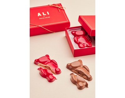 Mieliausia Valentino dienos pora – meškiuko formos rankų darbo šokolado plytelės, viduje slepiančios du skirtingus skonius: pieninio šokolado meškiukas su pekaninių karijų įdaru ir raudonas baltojo šokolado meškiukas su migdolų kremu, papildytu liofilizuotų aviečių gaiva.