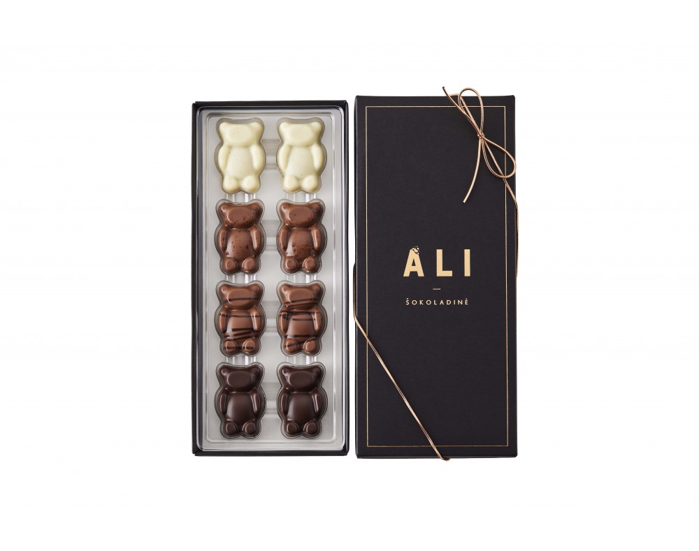 Ypatingai mieli šokoladiniai praline meškiukai - saldi naujiena, kuri tiesiog nepaliks abejingų! Daug rankų darbo ir 4 kruopščiai atrinkti šokolado bei riešutų deriniai: baltasis (32 %) su vanile ir pistacijų bei migdolų įdaru, pieninis (33,6 %) su lazdynų riešutų įdaru, pieninis (33,6 %) su pekaninių karijų įdaru ir juodasis (54 %) su kavos bei lazdynų riešutų. Supakuoti raudonoje šventinėje dėžutėje, kuri pradžiugins vos atidarius.
