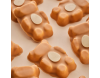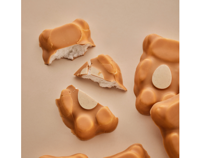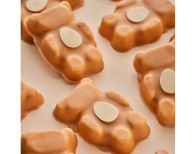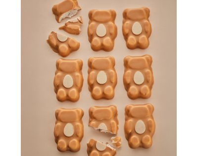 Minkštas, lengvas meškučio formos vanilinis zefyras, aplietas belgišku baltuoju šokoladu su pieninio ir apelsinų skonio šokolado natomis, rankose laikantis šokoladinį kiaušinį.