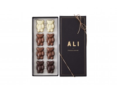 Ypatingai mieli šokoladiniai praline meškiukai - saldi naujiena, kuri tiesiog nepaliks abejingų! Daug rankų darbo ir 4 kruopščiai atrinkti šokolado bei riešutų deriniai: baltasis (32 %) su vanile ir pistacijų bei migdolų įdaru, pieninis (33,6 %) su lazdynų riešutų įdaru, pieninis (33,6 %) su pekaninių karijų įdaru ir juodasis (54 %) su kavos bei lazdynų riešutų. Supakuoti raudonoje šventinėje dėžutėje, kuri pradžiugins vos atidarius.